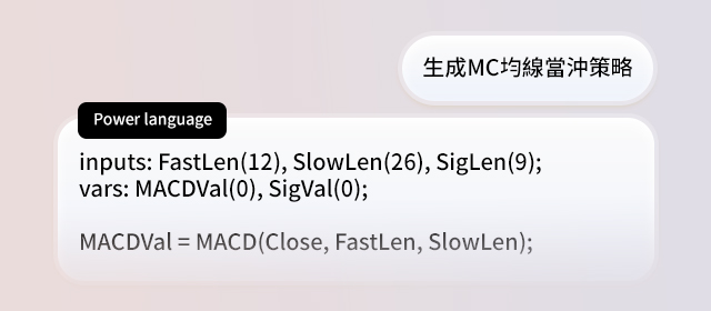- AI 策略生成:以自然語言輸入邏輯,自動生成 MultiCharts 指標與訊號語法。