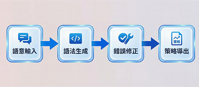 從語意輸入 → 語法生成 → 錯誤修正 → 策略導出,完整策略建構僅需幾分鐘完成,大幅提升開發效率與執行成功率。